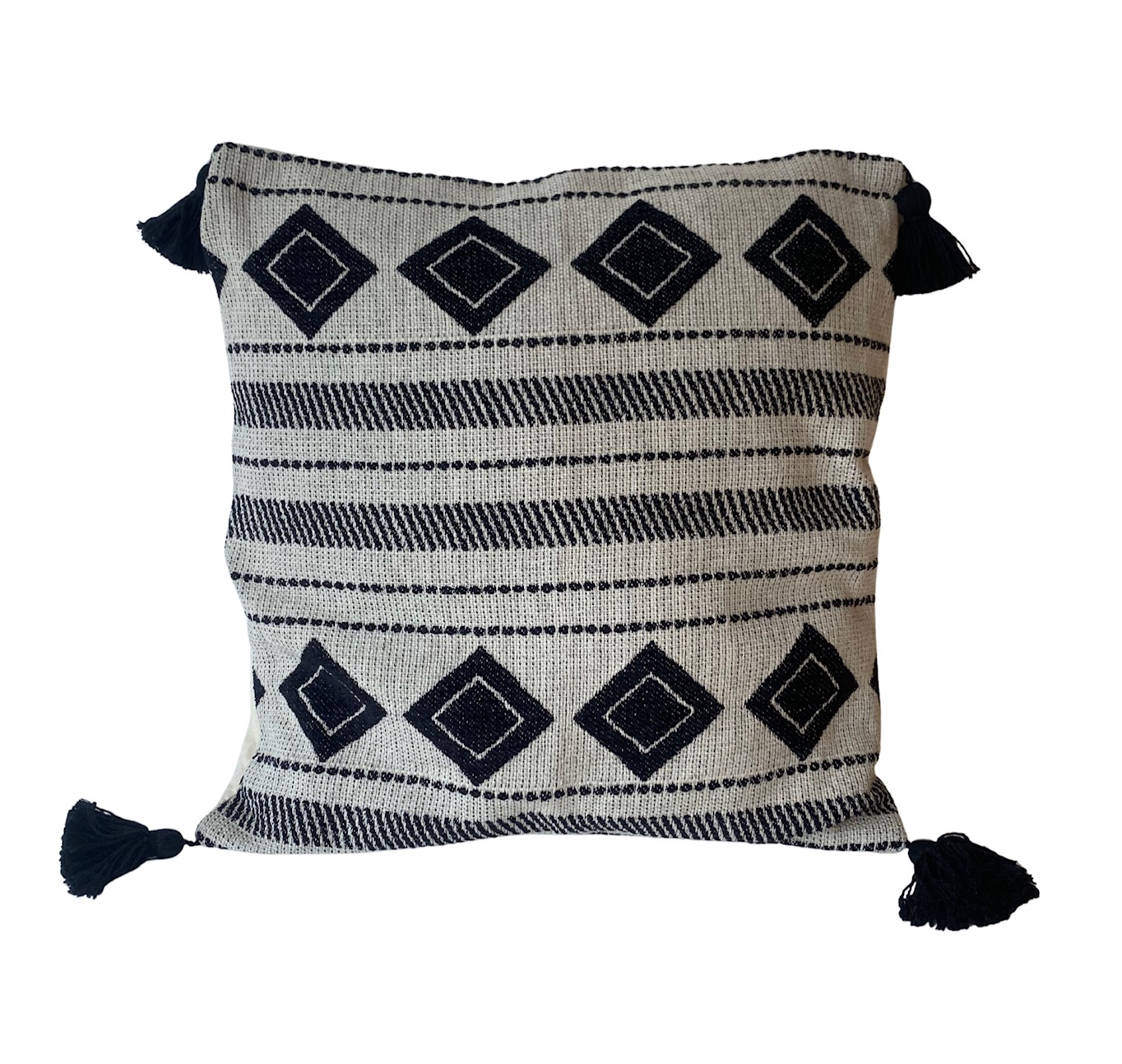 Capa de almofada em jacquard, estilo boho, preta e cru com pompom nas pontas.
