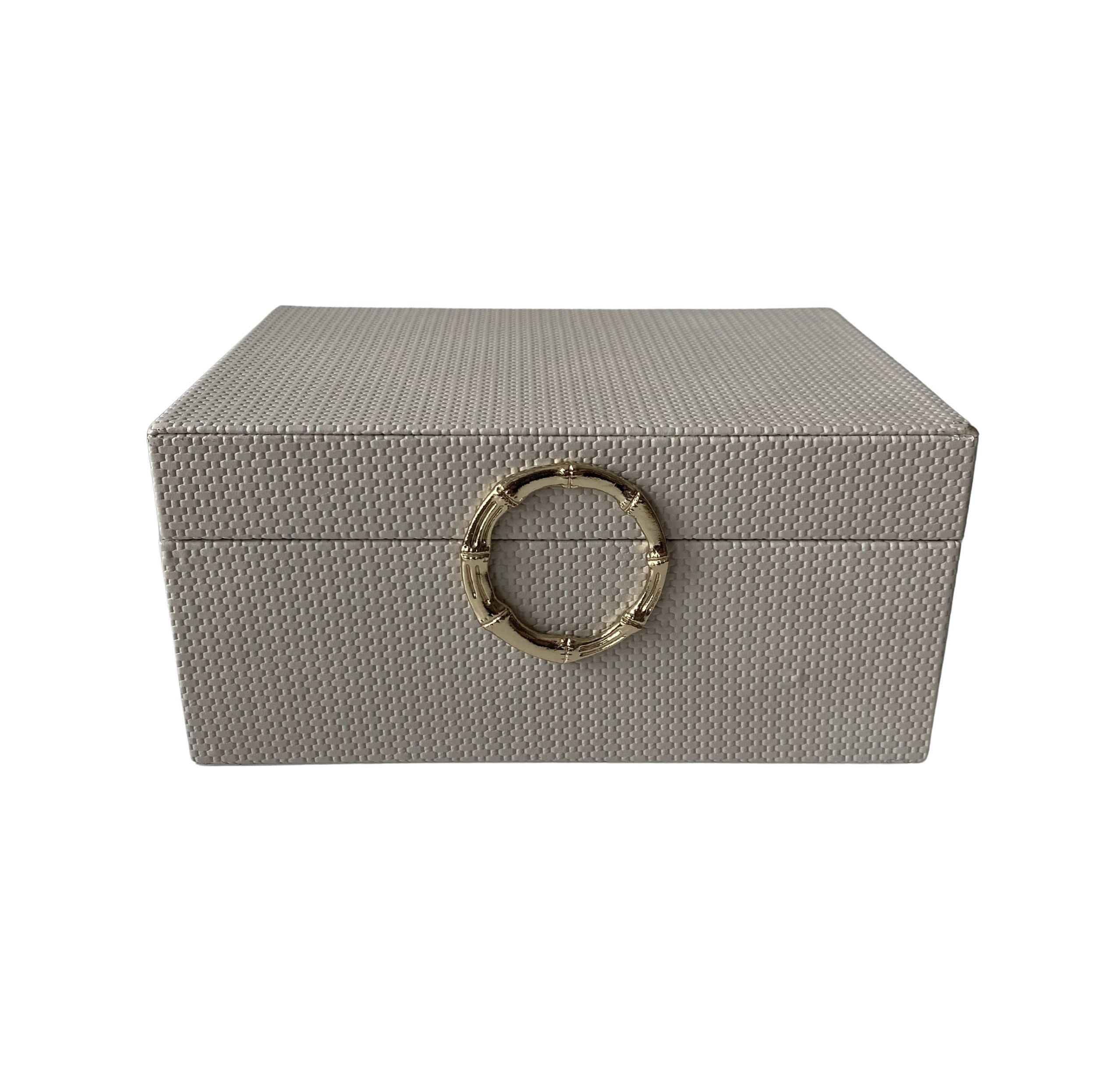 Caixa decorativa, em couro sintético, com detalhe dourado.