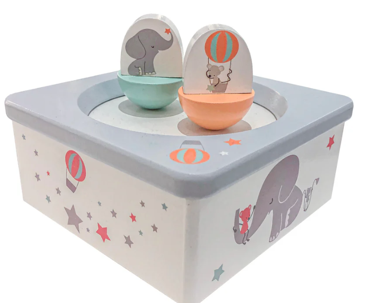 Caixa de música interativa elefante e foca, em madeira com ímã, fazendo os bonequinhos dançarem.