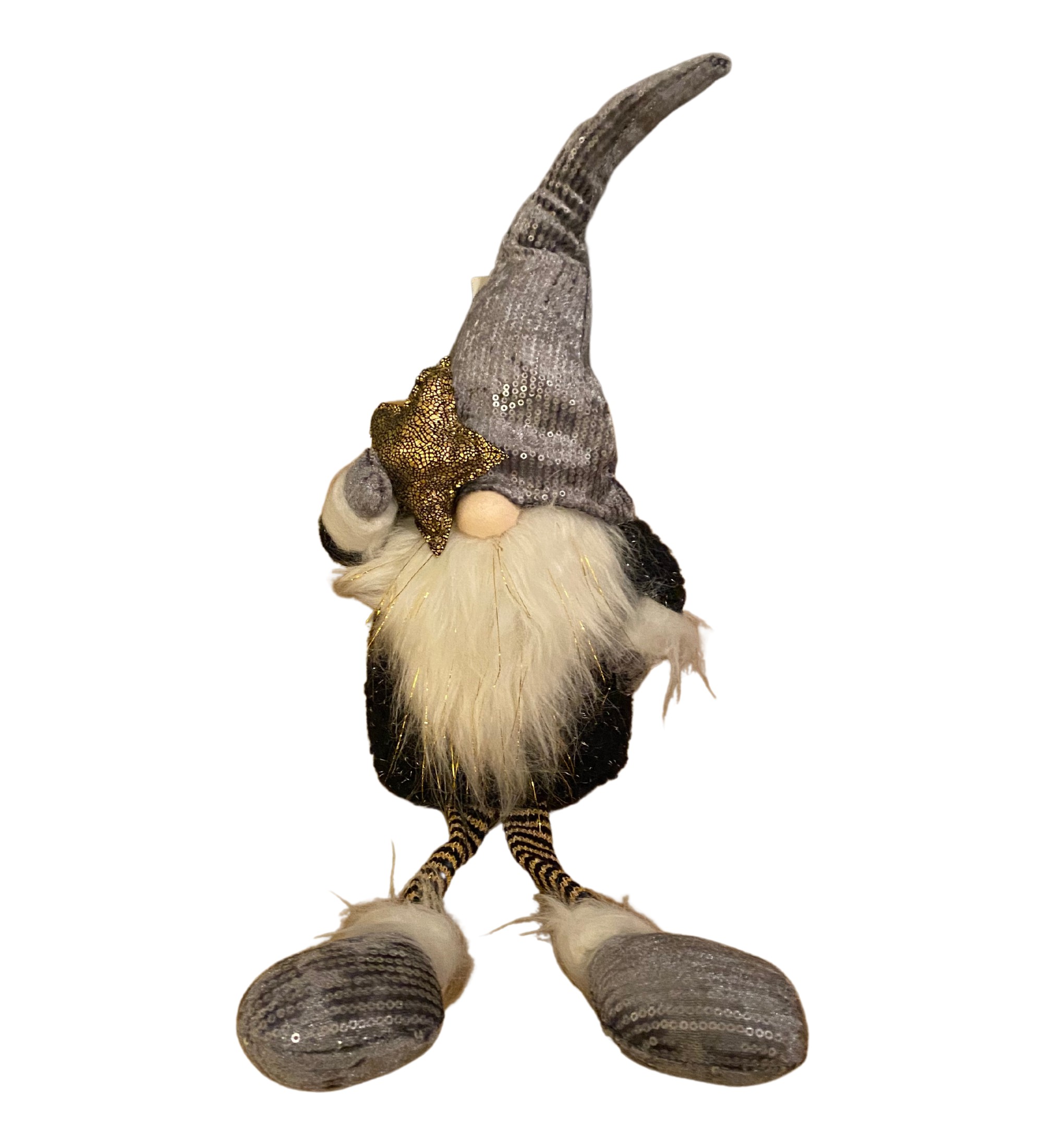 Gnomo, preto, chapéu cinza, com estrela, sentado.